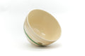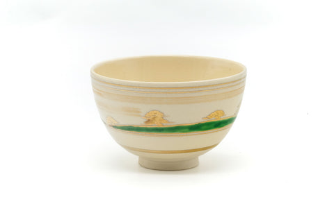 This beautiful Kyo-yaki chawan (matcha bowl) features a beige glaze decorated with a golden green landscape and trim.