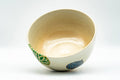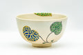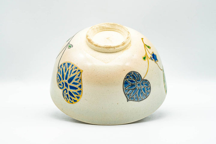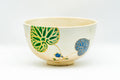 This Kyo-yaki chawan (matcha bowl) features a beige glaze decorated with beautiful green and gold leaves.