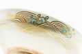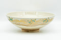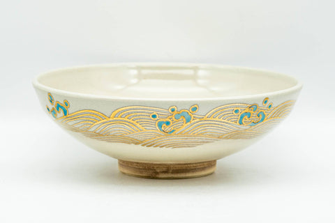 This Kyo-yaki summer chawan (matcha bowl) features a beautiful beige glaze decorated with wavy gold and blue motifs.