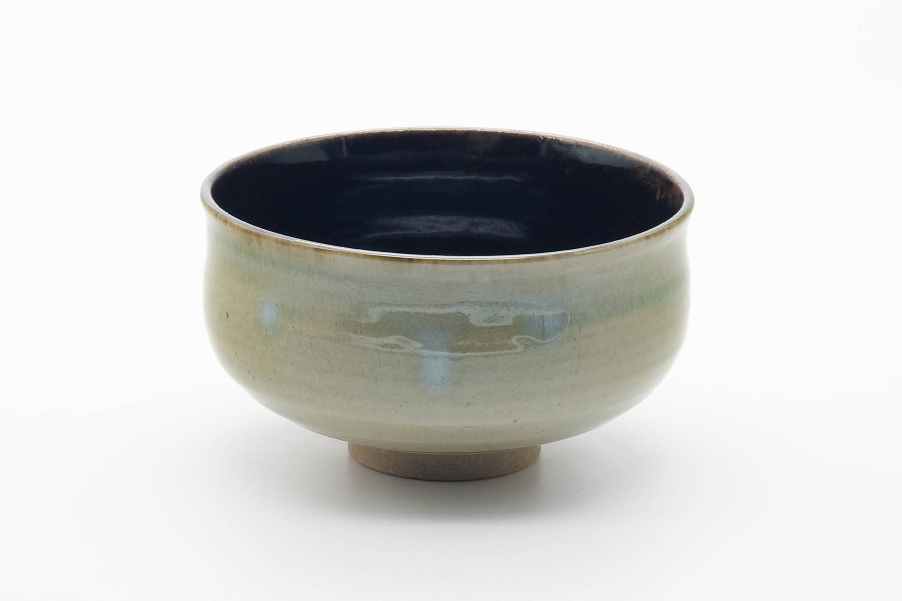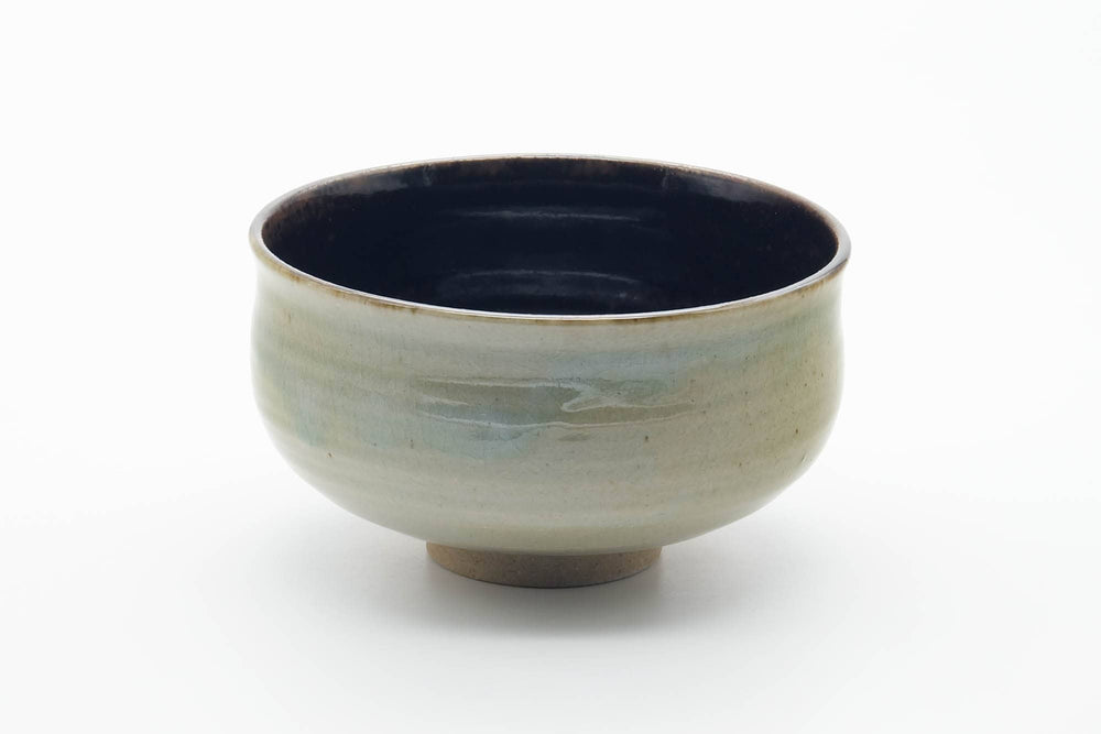 This chawan (matcha bowl) features a magnificent green-blue accented exterior glaze with a black interior glaze.