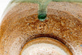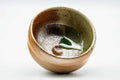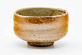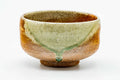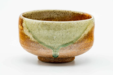 This hantsutsu-gata Shigaraki-yaki chawan (matcha bowl) features a stunning green celadon drip-glaze over its earthy clay.
