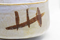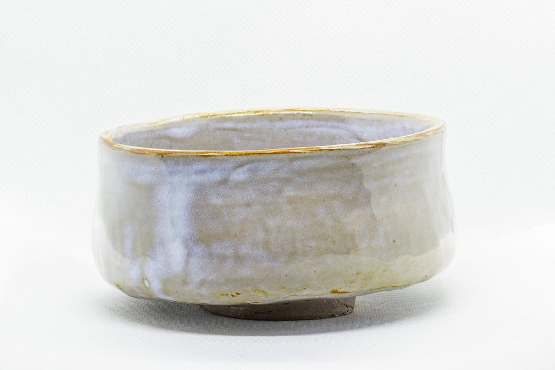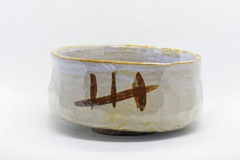 Vintage handmade chawan (matcha bowl), made in a low Hantsutsu-gata (half-cylinder) shape, decorated with a 4 brush stroke pattern.