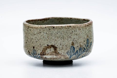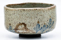 This Karatsu-yaki chawan (matcha bowl) features a grey speckled glaze decorated with blue flowers along its base.