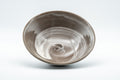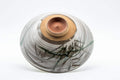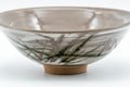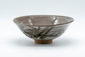 This hira-gata (flat-shaped) summer chawan (matcha bowl) is glazed in a warm brown featuring white hakeme (brush stroke) and long grass decorations. Its shallow shape allows the tea to cool quicker, making it perfect for warmer summer months.