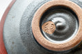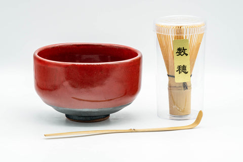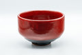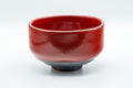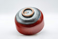 This hantsutsu-gata chawan (matcha bowl) features a glossy deep ruby red glaze with a metallic grey glazed base. Stamped 和.