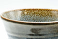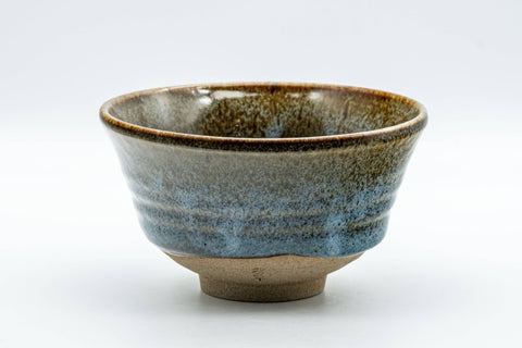 This ido-gata chawan (matcha bowl) features a brown tenmoku nagashi glaze with orange and blue highlights. Signed Housui (芳翠).