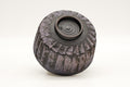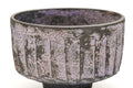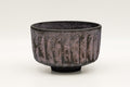 Igura ToshiyaThis Kiyomizu-yaki chawan (matcha bowl) is made in the classic hantsutsu-gata shape and is decorated in the classic sogimon (そぎ紋) style. Sogi, also called sogime or sogimon is a traditional ceramic decoration style of vertical fluting. On this chawan, the fluting design is widely spaced, giving a faceted impression. Atop a base glaze of textured matte black, this bowl sports patches of vibrant purple.