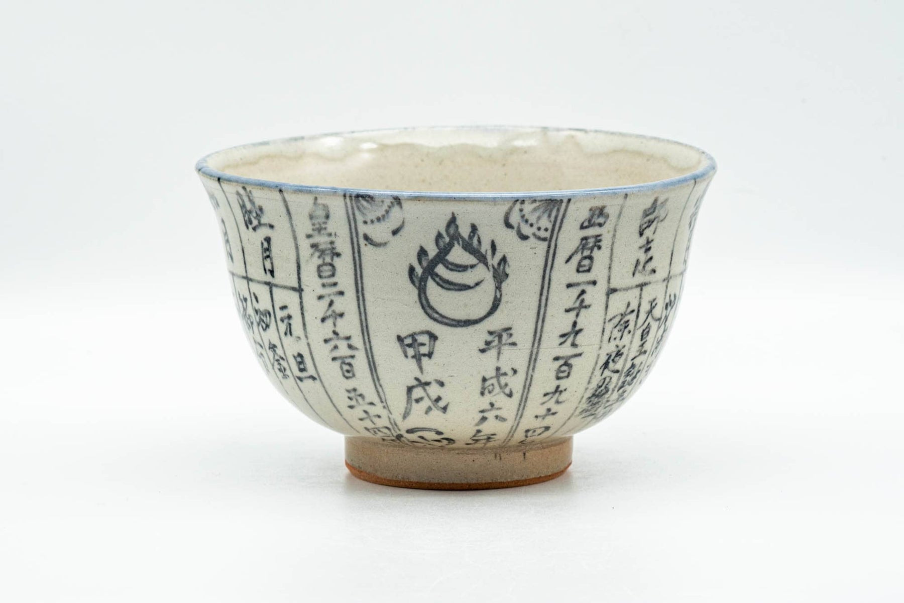 This chawan (matcha bowl) features a grey glaze decorated with kanji around its body and a motif at the base.