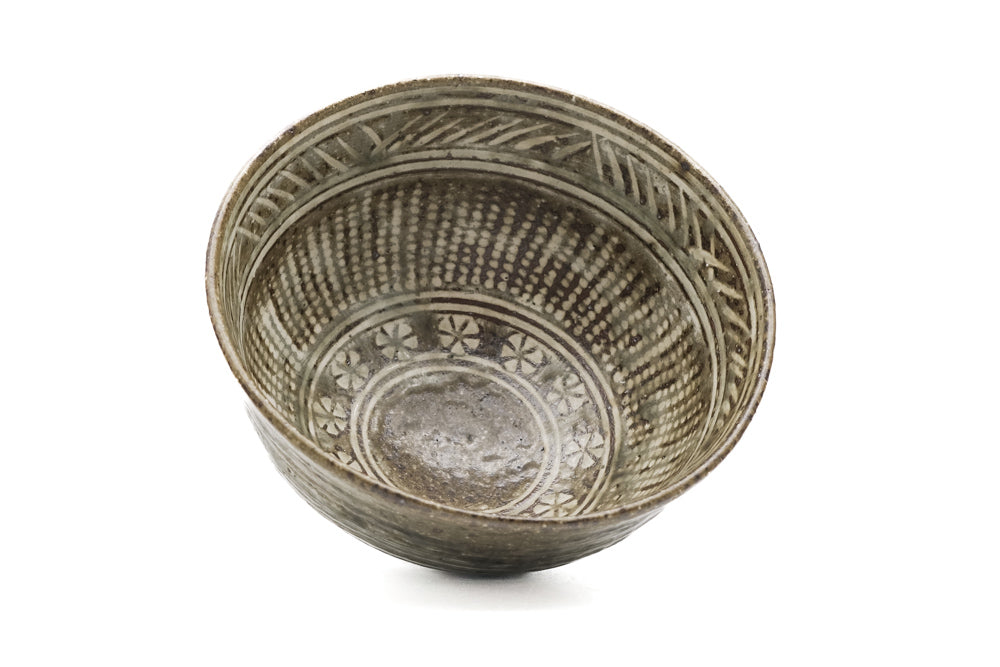 This elegant chawan (matcha bowl) is decorated in the Mishima (三島) style of slip inlay, a Korean technique in which white slip is inlaid into stamped patterns. Here, the interior features stamped flowers (印花 - inka) and incised lines. The outside of the bowl is accented with brush strokes of white slip (刷毛目 - hakeme). These white slip decorations contrast with the dark iron-rich clay and the ashy glaze. The foot is left unglazed as is trimmed in the classic bamboo-node style (竹の節高台 - takenofushi koudai).