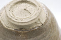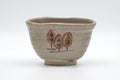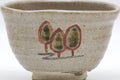 This Takatori-yaki chawan (matcha bowl) has a katazori-gata shape with and undulating lip and noticeable rokurome (ろくろ目 - potters' wheel marks) which show the flow of the potter's fingers as they shaped the piece on the wheel. The bowl has a translucent ash glaze, decorated with a simple drawing of three trees.