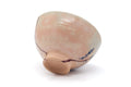 This sugi-nari Odaka-yaki (尾高焼) chawan (matcha bowl) features a beige and white hakeme brush stroke glaze, with subtle pink gohonte spots and calligraphy around its exterior. Made by Kuroishi Kiln (黒石窯).