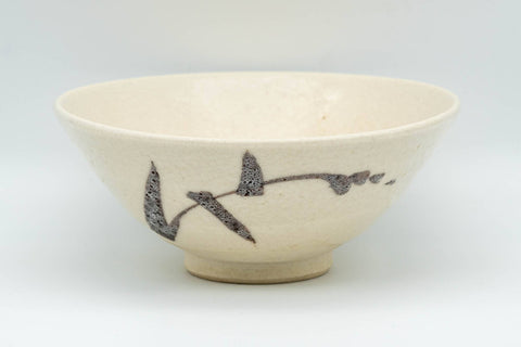 This hira-gata (flat-shaped) summer chawan (matcha bowl) features a white shino glaze decorated with a long grass motif.