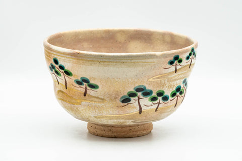 This wonderful dojimari-gata Hagi-yaki chawan (matcha bowl) features a beige gohonte spotted glaze decorated with trees.