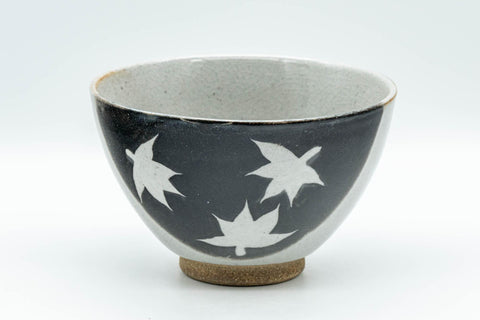 This sugi-nari chawan (matcha bowl) features a soft, speckled grey glaze decorated with painted black momiji (Japanese maple) leaves, and accented by a patch of black glaze with momiji silhouettes.