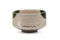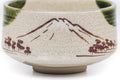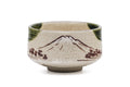 This Ao-Oribe chawan (matcha bowl) is glazed in a finely crazed light cream, decorated with an iron underpainting of a snow-capped Mount Fuji and accented with splashes of the iconic copper green Oribe glaze. Unlike more traditional Oribe chawan which have distorted shapes, this bowl is perfectly round making it easy for beginners to use.