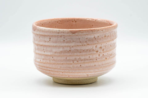 This hantsutsu-gata chawan (matcha bowl) features a pink shino glaze that is heavily textured with pinholes—called 'suana' (nest holes) or 'yuzuhada' (yuzu skin) in Japanese—on the exterior but is smooth on the interior.