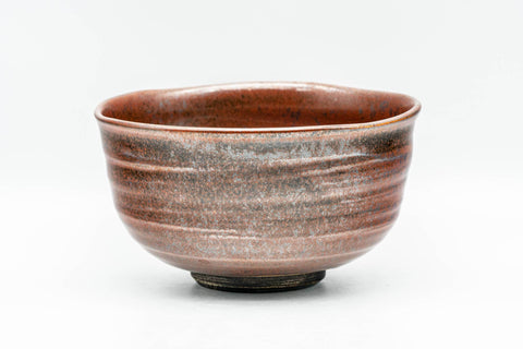 This wabi-sabi chawan (matcha bowl) features a spiraling clay body with a stunning red wagashi tenmoku glaze.