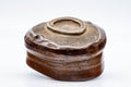 Kutsu-gata (沓形 - clog/shoe-shaped) bowls were developed by famed chajin Furuta Oribe in the late 1500s/early 1600s. Oribe purposely distorted his bowls, manipulating them into various warped shapes, which played into his aesthetic philosophy, called hyouge (ひょうげ/剽げ/へうげ) which roughly translates to ‘playful’, ‘charming’, ‘jocular’, etc.