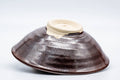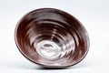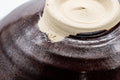 This hira-gata (flat-shaped) summer chawan (matcha bowl) features thumb-indent and is glazed with a metallic rust-red iron glaze (鉄釉). Its shallow shape allows the tea to cool quicker, making it perfect for warmer summer months.