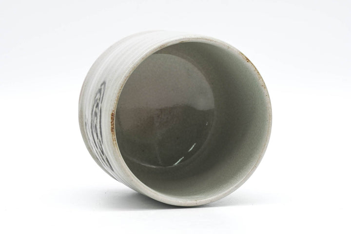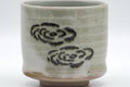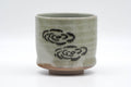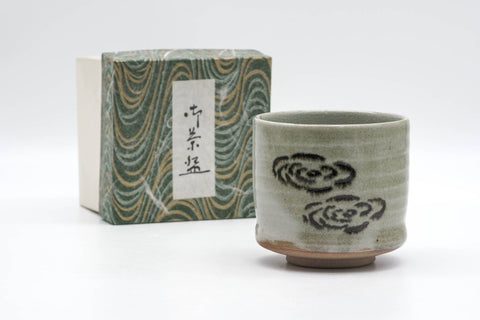 This hantsutsu-gata chawan (matcha bowl) features a spiraling, cylindrical body with a light sage glaze. Its abstract motif resembles a pair of flowers.