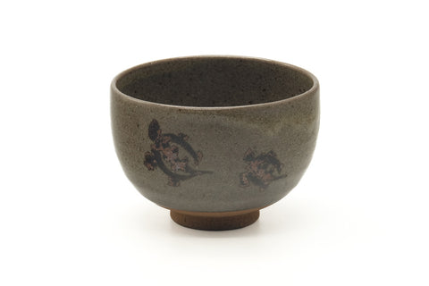This chawan (matcha bowl) features a dark gray glaze decorated with turtles.Dimensions:12.3cm (4.8in) - width8.3cm (3.3in) - height600ml - capacityCondition: ExcellentThis vintage Japanese item ships from Thailand.