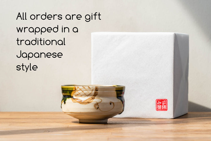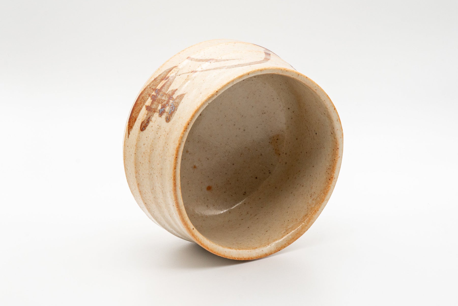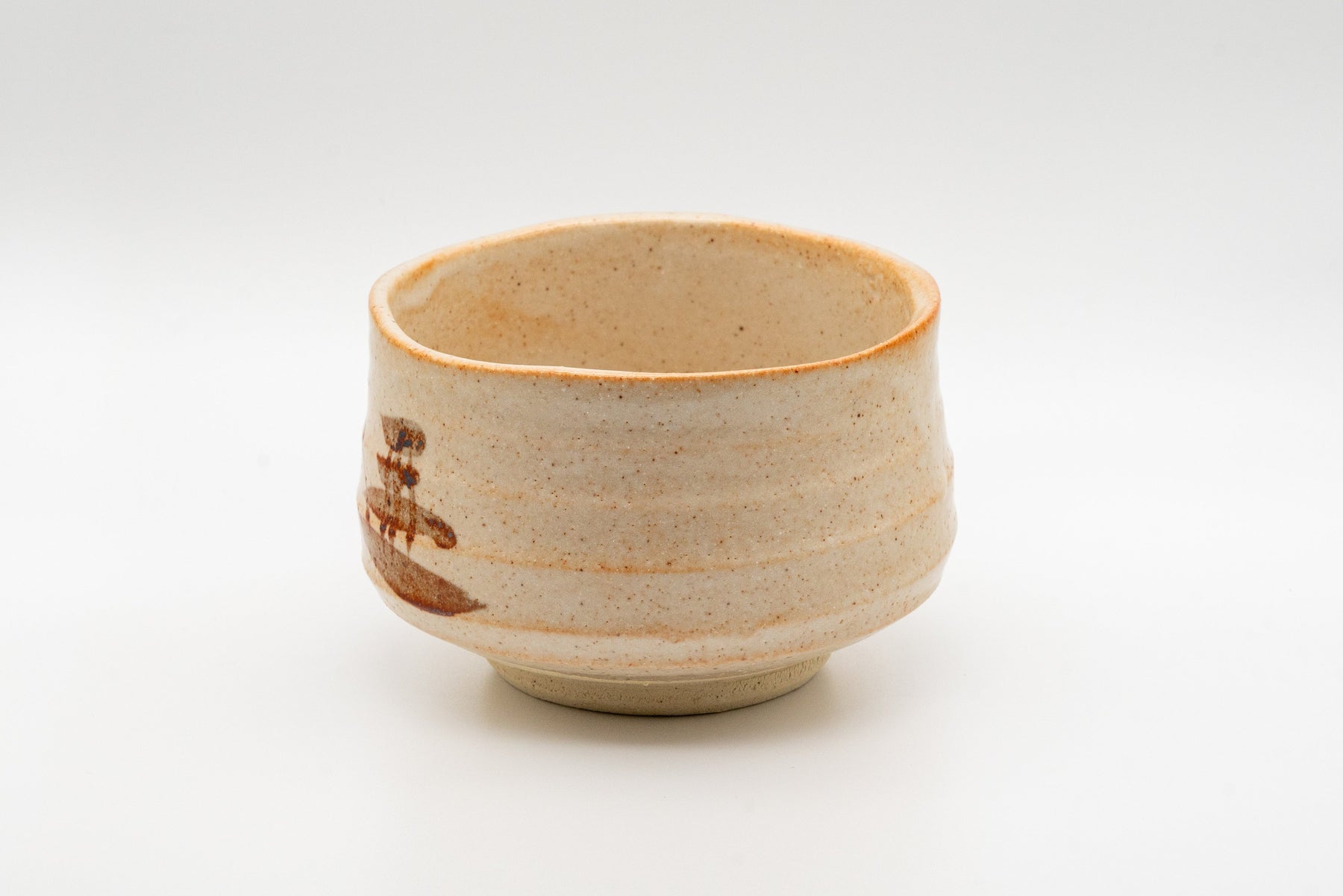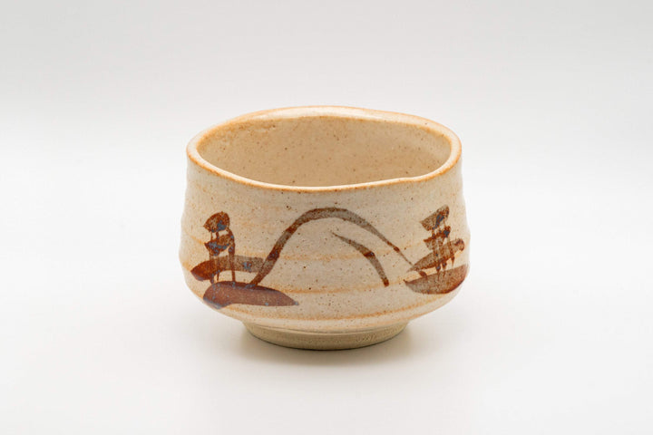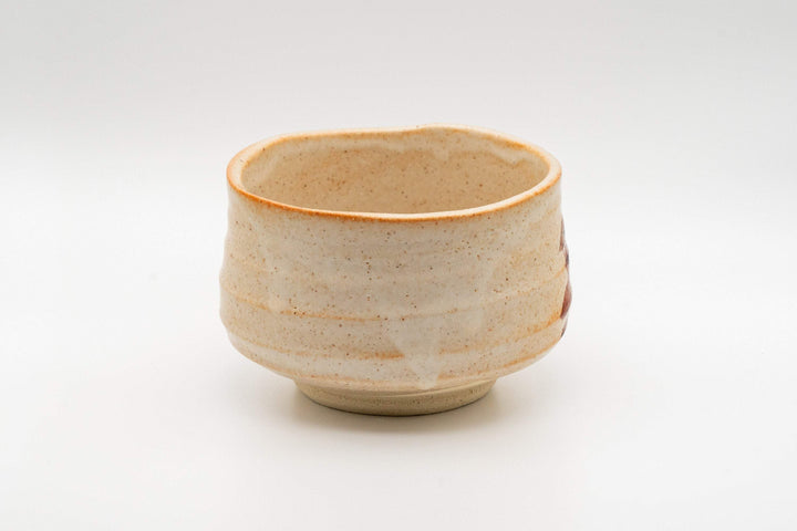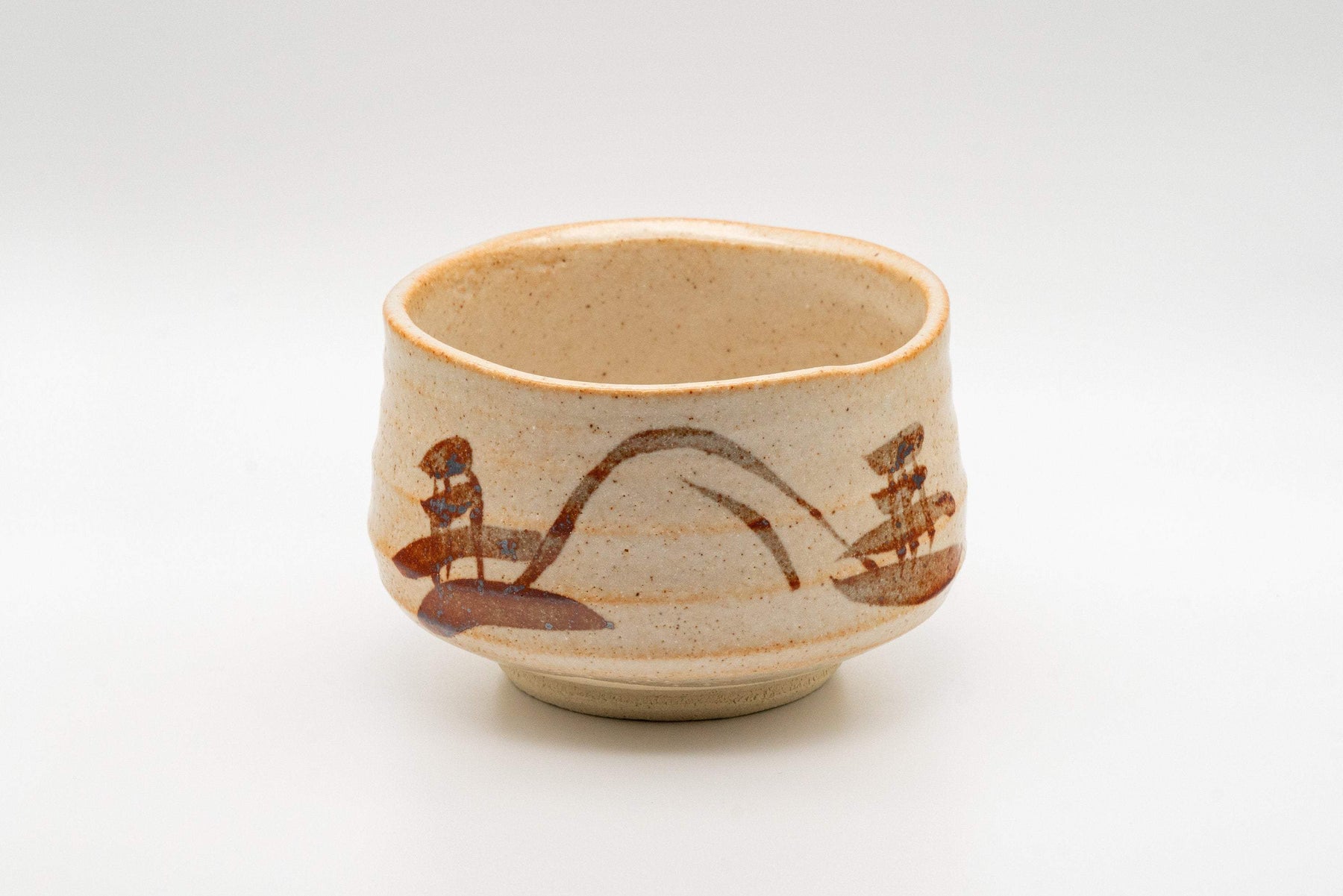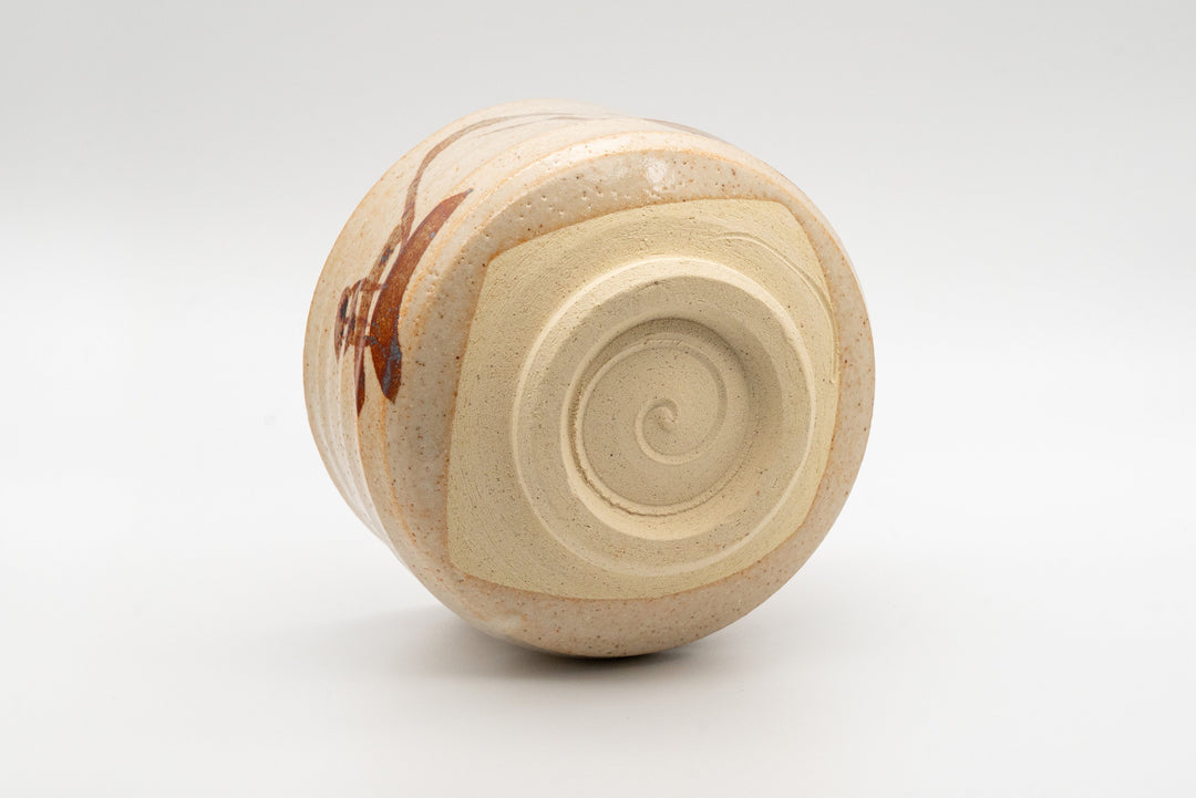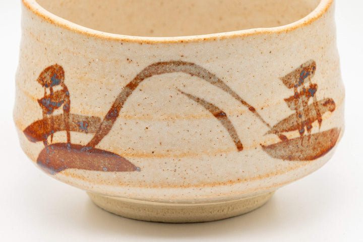 This hantsutsu-gata chawan (matcha bowl) features a white and orange shino glaze with a painted brown plant.