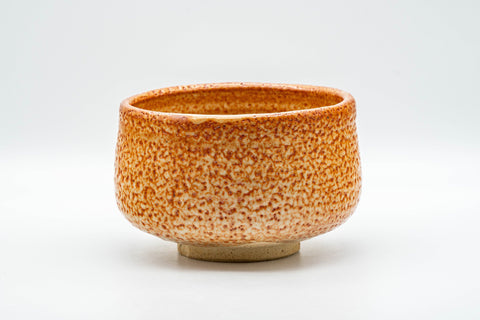 This chawan (matcha bowl) features an orange and white shino glaze that is heavily textured with pinholes—called 'suana' (nest holes) or 'yuzuhada' (yuzu skin) in Japanese—on the exterior but is smooth on the interior.