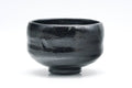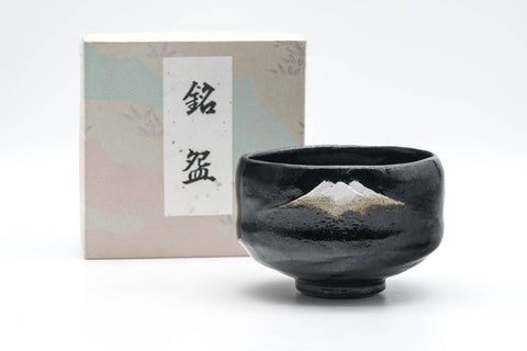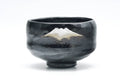This classic Kuro-raku chawan (matcha bowl) features a slightly waisted hantsutsu-gata shape and is glazed completely in a deep black, silhouetted with a Mt. Fuji motif.