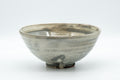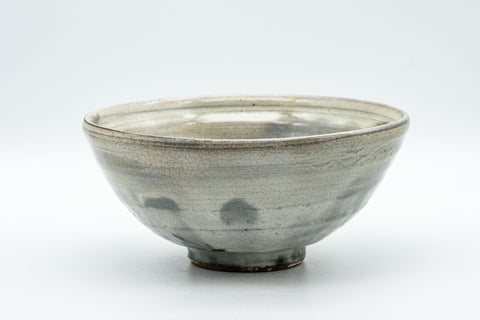 This natsu-chawan (summer matcha bowl) features a finely crazed glaze and a white and grey hakeme (brush stroke decoration). Its flatter shape is perfect for letting tea cool down in the warmer months. Signed 庄.