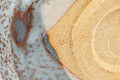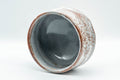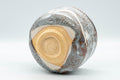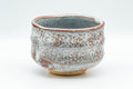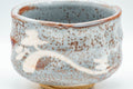 This hantsutsu-gata chawan (matcha bowl) features a light blue shino glaze that is heavily textured with pinholes—called 'suana' (nest holes) or 'yuzuhada' (yuzu skin) in Japanese—on the exterior but is smooth on the interior. The bowl is also decorated with a white artistic motif.