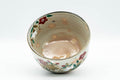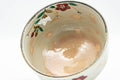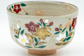 This hantsutsu-gata Kyo-yaki chawan (matcha bowl) features a crazed grey glaze with beige spots in a pattern known as gohonte. The bowl is decorated with painted white and red flowers with gold accents. Made by Tanaka Kousen (田中香泉).