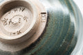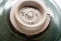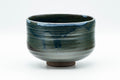 This hantsutsu-gata chawan (matcha bowl) features a deep teal glazes accented with splashes of blue.