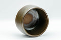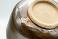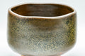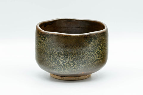 This small hantsutsu-gata chawan (matcha bowl) has an undulating 'mountain path' (yamamichi - 山道) rim and features a brown glaze, flecked with gold 'tea dust'. The bottom of the interior is unglazed.