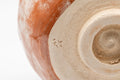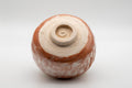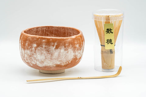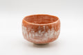 This hand-formed hantsutsu-gata chawan (matcha bowl) features a brushed brick red glaze. As opposed to the perfect symmetry that wheel-thrown bowls have, the gentle, wabi-sabi irregularity of this bowl comes from the hand-forming process.