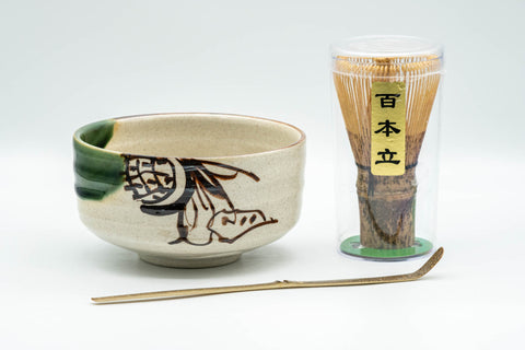 Japanese Matcha Set - 織部焼 Waisted Oribe-yaki chawan with Bamboo Chasen Whisk and Chashaku Scoop - 400ml
