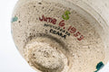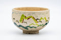 This wan-nari chawan (matcha bowl) features a textured white clay decorated with colourful mountainous motifs.