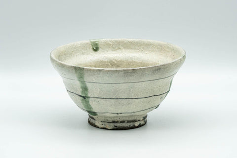 This ido-gata chawan (matcha bowl) features a textured white glaze, decorated with green ash drips and horizontal lines.