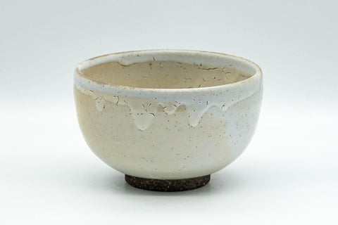 This wan-nari chawan (matcha bowl) features a textured white shino glaze.