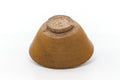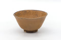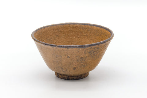 This weathered tenmoku-gata chawan (matcha bowl) features a deep yellow/ earthy mustard glaze.