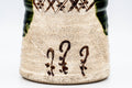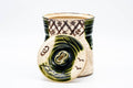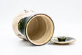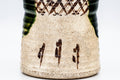 Oribe-yaki (織部焼) is a type of Japanese pottery known for its free flowing glazes and asymmetrical, hand-formed shapes. Dating in the late 16th century, Oribe ware takes its name from legendary tea master Furuta Oribe (古田 織部) who is believed to have played a large part in its development. Oribe wares are decorated with abstract designs and splashes of free-flowing vibrant green or deep black glaze. With these distorted shapes and novel decorations, Oribe-yaki exudes a charm that matches Furuta Oribe’s philosophy of hyouge (へうげ) or playfulness. One of the most popular styles of Oribe ware is Ao-Oribe or Green Oribe, which is decorated with geometric patterns painted with an iron glaze and then partially covered in a vibrant green copper-sulfate glaze which contrasts against the light background.