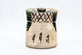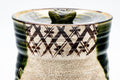 This Oribe-yaki mizusashi (water container) features a waisted shaped decorated with abstract underglaze painting, covered in a translucent crazed glaze, and accented with the iconic Oribe green drip-glaze.