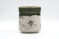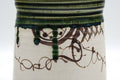 This Oribe-yaki mizusashi (water container) features a waisted shaped decorated with abstract underglaze painting, covered in a translucent crazed glaze, and accented with the iconic Oribe green drip-glaze.