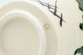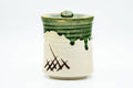 Oribe-yaki (織部焼) is a type of Japanese pottery known for its free flowing glazes and asymmetrical, hand-formed shape. Dating from the 16th century, Oribe ware exists in many styles. One of the most famous is Ao-Oribe or Green Oribe, which is often decorated with geometric patterns painted with an iron glaze and then partially covered in a vibrant green copper-sulfate glaze which contrasts against the white background.