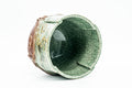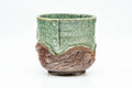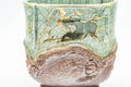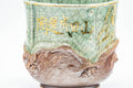 This heavy, large Obori Soma-yaki lid-less mizusashi (fresh water container) features a stunning green celadon glaze, a brown textured base, and classic gold horse motifs.