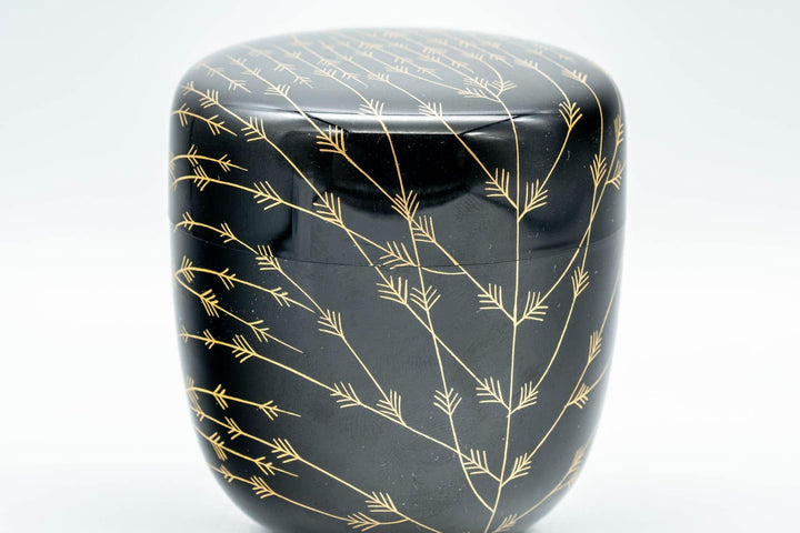 This black lacquer natsume (matcha caddy) is decorated with amazing gold motifs that wrap all around and align perfectly over the body and lid.