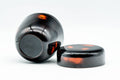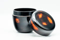 This black lacquer natsume (matcha caddy) is decorated with amazing orange patterned spots across its body and lid.