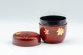 This red lacquer natsume (matcha caddy) is a decorated with floral motifs in gold, red, and black.