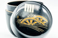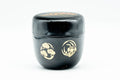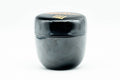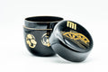 This black urushi lacquer natsume (matcha caddy) is decorated with gold floral motifs and a water wheel across its body and lid.