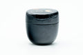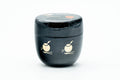 This black lacquer natsume (matcha caddy) is made from wood coated with traditional urushi lacquer and decorated with geometric motifs.