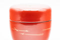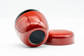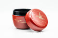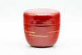 This lacquer natsume (matcha caddy) is made from wood coated with traditional urushi red lacquer on its exterior and black lacquer on its interior. This natsume is decorated with a gold crane and geometric patterns.